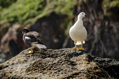Caption: Chile, PatagonienZwei Kelp Gaense (Chloephaga hybrida) auf einem Felsen an der Kueste von Chiloe (Chile, Patagonien): weisses Maennchen und graues Weibchen. Chiloe, 14.12.2025.