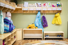 Caption: KindergartenSymbolbild: Kindergarten. Bunte Kinderkleidung haengt an einer Garderobe. Aufgenommen im Rahmen der didacta Bildungsmesse in Koeln, 10.03.2026.