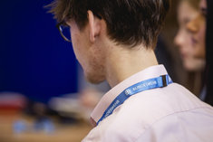 Caption: Jugendliche und BundeswehrEin Jugendlicher traegt einen Anhaenger mit Logo und Schriftzug der Bundeswehr. Aufgenommen im Rahmen der didacta in Koeln, 10.03.2026.