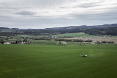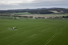 Ein Traktor mit einer Feldspritze auf einem Feld, aufgenommen in Wiesa, 10.04.2026.
