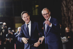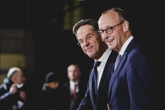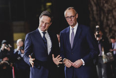 Caption: Bundeskanzler Merz trifft europaeische Staats- und Regierungschefs im Bundeskanzleramt(L-R) Mark Rutte, Generalsekretaer der NATO, und Friedrich Merz (CDU), Bundeskanzler, aufgenommen im Rahmen eines ersten Aufeinandertreffens im Bundeskanzleramt in Berlin, 15.12.2025. Der Bundeskanzler kommt am Abend nach dem bilateralen Treffen mit dem ukrainischen Praesidenten zusammen mit weiteren europaeischen Staats- und Regierungschefinnen und -chefs sowie den Spitzen von EU und NATO.