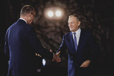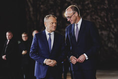 Caption: Bundeskanzler Merz trifft europaeische Staats- und Regierungschefs im Bundeskanzleramt(L-R) Donald Tusk, Ministerpraesident von Polen, und Friedrich Merz (CDU), Bundeskanzler, aufgenommen im Rahmen eines ersten Aufeinandertreffens im Bundeskanzleramt in Berlin, 15.12.2025. Der Bundeskanzler kommt am Abend nach dem bilateralen Treffen mit dem ukrainischen Praesidenten zusammen mit weiteren europaeischen Staats- und Regierungschefinnen und -chefs sowie den Spitzen von EU und NATO.