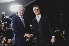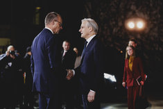 Caption: Bundeskanzler Merz trifft europaeische Staats- und Regierungschefs im Bundeskanzleramt(R-L) Alexander Stubb, Praesident von Finnland, und Friedrich Merz (CDU), Bundeskanzler, aufgenommen im Rahmen eines ersten Aufeinandertreffens im Bundeskanzleramt in Berlin, 15.12.2025. Der Bundeskanzler kommt am Abend nach dem bilateralen Treffen mit dem ukrainischen Praesidenten zusammen mit weiteren europaeischen Staats- und Regierungschefinnen und -chefs sowie den Spitzen von EU und NATO.