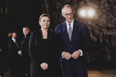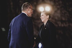 Caption: Bundeskanzler Merz trifft europaeische Staats- und Regierungschefs im Bundeskanzleramt(R-L) Mette Frederiksen, Ministerpraesident von Daenemark, und Friedrich Merz (CDU), Bundeskanzler, aufgenommen im Rahmen eines ersten Aufeinandertreffens im Bundeskanzleramt in Berlin, 15.12.2025. Der Bundeskanzler kommt am Abend nach dem bilateralen Treffen mit dem ukrainischen Praesidenten zusammen mit weiteren europaeischen Staats- und Regierungschefinnen und -chefs sowie den Spitzen von EU und NATO.