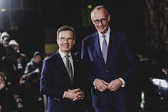 Caption: Bundeskanzler Merz trifft europaeische Staats- und Regierungschefs im Bundeskanzleramt(L-R) Ulf Kristersson, Ministerpraesident von Schweden, und Friedrich Merz (CDU), Bundeskanzler, aufgenommen im Rahmen eines ersten Aufeinandertreffens im Bundeskanzleramt in Berlin, 15.12.2025. Der Bundeskanzler kommt am Abend nach dem bilateralen Treffen mit dem ukrainischen Praesidenten zusammen mit weiteren europaeischen Staats- und Regierungschefinnen und -chefs sowie den Spitzen von EU und NATO.