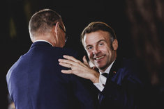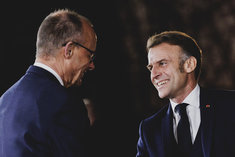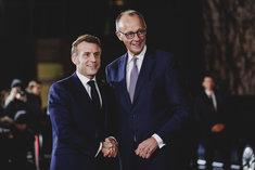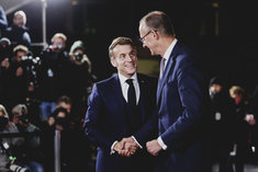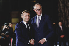 Caption: Bundeskanzler Merz trifft europaeische Staats- und Regierungschefs im Bundeskanzleramt(L-R) Emmanuel Macron, Praesident von Frankreich, und Friedrich Merz (CDU), Bundeskanzler, aufgenommen im Rahmen eines ersten Aufeinandertreffens im Bundeskanzleramt in Berlin, 15.12.2025. Der Bundeskanzler kommt am Abend nach dem bilateralen Treffen mit dem ukrainischen Praesidenten zusammen mit weiteren europaeischen Staats- und Regierungschefinnen und -chefs sowie den Spitzen von EU und NATO.