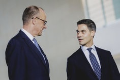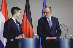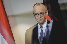 Caption: Bundeskanzler Merz empfaengt den Ministerpraesidenten der Niederlande Rob JettenFriedrich Merz (CDU), Bundeskanzler, aufgenommen im Rahmen des Empfangs des niederlaendischen Ministerpraesidenten (nicht im Bild) mit militaerischen Ehren im Bundeskanzleramt in Berlin, 16.03.2026.