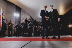 Caption: Bundeskanzler Merz trifft europaeische Staats- und Regierungschefs im Bundeskanzleramt(R-L) Alexander Stubb, Praesident von Finnland, und Friedrich Merz (CDU), Bundeskanzler, aufgenommen im Rahmen eines ersten Aufeinandertreffens im Bundeskanzleramt in Berlin, 15.12.2025. Der Bundeskanzler kommt am Abend nach dem bilateralen Treffen mit dem ukrainischen Praesidenten zusammen mit weiteren europaeischen Staats- und Regierungschefinnen und -chefs sowie den Spitzen von EU und NATO.