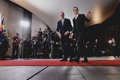 Caption: Bundeskanzler Merz trifft europaeische Staats- und Regierungschefs im Bundeskanzleramt(L-R) Jared Kushner, Berater und Schwiegersohn des US-Praesidenten, und Steve Witkoff, Sondergesandter des US-Praesidenten, aufgenommen im Rahmen eines ersten Aufeinandertreffens mit dem Bundeskanzler (nicht im Bild) im Bundeskanzleramt in Berlin, 15.12.2025. Der Bundeskanzler kommt am Abend nach dem bilateralen Treffen mit dem ukrainischen Praesidenten zusammen mit weiteren europaeischen Staats- und Regierungschefinnen und -chefs sowie den Spitzen von EU und NATO.