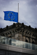 Caption: Flagge auf HalbmastDie Flagge der Europaeischen Union weht anlaesslich des Gedenktags fuer die Opfer terroristischer Gewalt auf dem Reichstagsgebaeude auf Halbmast. Berlin, 11.03.2026.