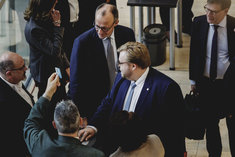 Friedrich Merz (CDU), Bundeskanzler, und Leif Erik Bodin, Mitglied des Deutschen Bundestages (CDU), aufgenommen im Rahmen der Abstimmung ueber das Rentenpaket im Deutschen Bundestag in Berlin, 05.12.2025. Die Junge Gruppe der CDU/CSU-Fraktion droht mit Ablehnung des Paketes, was zu einer Krise der Koalition fuehren koennte.