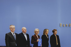 Caption: Vorstellung des Jahresgutachtens 2025/26 des Sachverstaendigenrates(R-L) Veronika Grimm, Mitglied des Sachverstaendigenrates Wirtschaft, Ulrike Malmendier, Mitglied des Sachverstaendigenrates Wirtschaft, Monika Schnitzer, Vorsitzende des Sachverstaendigenrates zur Begutachtung der gesamtwirtschaftlichen Entwicklung, Achim Truger, Mitglied des Sachverstaendigenrates Wirtschaft, und Martin Werding, Mitglied des Sachverstaendigenrates Wirtschaft, aufgenommen im Rahmen der Vorstellung des Jahresgutachtens 2025/26 des Sachverstaendigenrat zur Begutachtung der gesamtwirtschaftlichen Entwicklung in Berlin, 12.11.2025.