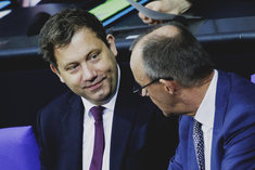 Caption: Regierungserklaerung von Bundeskanzler Merz(R-L) Friedrich Merz (CDU), Bundeskanzler, und Lars Klingbeil, Bundesminister der Finanzen, aufgenommen nach der Regierungserklaerung im Deutschen Bundestag in Berlin, 29.01.2026.