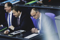 Caption: Regierungserklaerung von Bundeskanzler Merz(L-R) Alexander Dobrindt (CSU), Bundesminister des Innern, Lars Klingbeil, Bundesminister der Finanzen, und Friedrich Merz (CDU), Bundeskanzler, aufgenommen nach der Regierungserklaerung im Deutschen Bundestag in Berlin, 29.01.2026.