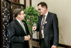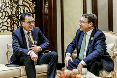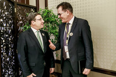 Caption: BM Mueller besucht KuwaitGerd Mueller, CSU, Bundesentwicklungsminister, im Gespraech mit Achim Steiner, Leiter des United Nations Development Programme, im Rahmen der Irak-Wiederaufbaukonferenz Kuwait City, 14.02.2018. Copyright: Michael Gottschalk/photothek.net