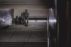 Soldaten laufen eine Treppe hinunter in einen U-Bahnhof, aufgenommen im Rahmen der Bundeswehr-Uebung Operation 'Bollwerk Baerlin' in Berlin, 19.11.2025. Waehrend des Uebungsszenarios des Wachbataillon der Bundeswehr sollen Saboteure einer U-Bahn im Uebungstunnel Jungfernheide festgesetzt sowie verletzte Soldaten geborgen und versorgt werden.