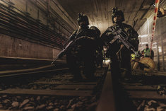 Soldaten in einem U-Bahn-Schacht, aufgenommen im Rahmen der Bundeswehr-Uebung Operation 'Bollwerk Baerlin' in Berlin, 19.11.2025. Waehrend des Uebungsszenarios des Wachbataillon der Bundeswehr sollen Saboteure einer U-Bahn im Uebungstunnel Jungfernheide festgesetzt sowie verletzte Soldaten geborgen und versorgt werden.