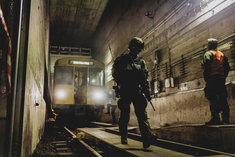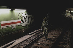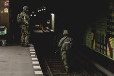 Soldaten an einer U-Bahn, aufgenommen im Rahmen der Bundeswehr-Uebung Operation 'Bollwerk Baerlin' in Berlin, 19.11.2025. Waehrend des Uebungsszenarios des Wachbataillon der Bundeswehr sollen Saboteure einer U-Bahn im Uebungstunnel Jungfernheide festgesetzt sowie verletzte Soldaten geborgen und versorgt werden.