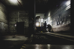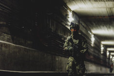 Eine Soldatin in einem U-Bahn-Tunnel, aufgenommen im Rahmen der Bundeswehr-Uebung Operation 'Bollwerk Baerlin' in Berlin, 19.11.2025. Waehrend des Uebungsszenarios des Wachbataillon der Bundeswehr sollen Saboteure einer U-Bahn im Uebungstunnel Jungfernheide festgesetzt sowie verletzte Soldaten geborgen und versorgt werden.