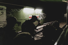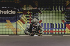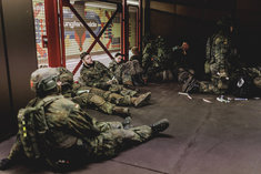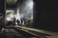 Verletzte Soldaten sitzen auf dem Bahnsteig, aufgenommen im Rahmen der Bundeswehr-Uebung Operation 'Bollwerk Baerlin' in Berlin, 19.11.2025. Waehrend des Uebungsszenarios des Wachbataillon der Bundeswehr sollen Saboteure einer U-Bahn im Uebungstunnel Jungfernheide festgesetzt sowie verletzte Soldaten geborgen und versorgt werden.
