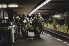 Soldaten bergen einen Verletzten, aufgenommen im Rahmen der Bundeswehr-Uebung Operation 'Bollwerk Baerlin' in Berlin, 19.11.2025. Waehrend des Uebungsszenarios des Wachbataillon der Bundeswehr sollen Saboteure einer U-Bahn im Uebungstunnel Jungfernheide festgesetzt sowie verletzte Soldaten geborgen und versorgt werden.