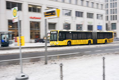 Caption: Regierungsviertel im SchneeEin Ziehharmonikabus der BVG faehrt am Potsdamer Platz in Berlin entlang, 06.02.2026.