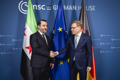 Stichworte: Politik politics Johann Wadephul MSC Asaad al-Schaibani bilateral meeting bilat handshake haende halbe Figur Halbfigur half-length waist up Anschnitt gate zu zweit Syrien Syria looking at each other