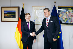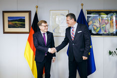 Johann Wadephul (CDU), Bundesaussenminister, trifft Maros Sefcovic, Kommissar fuer Handel der Europaeischen Union zu einem Gespraech in Bruessel, 27.10.2025. Fotografiert im Auftrag des Auswaertigen Amtes (AA)