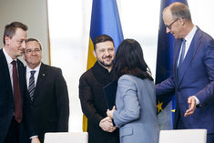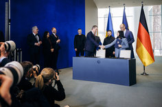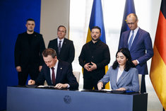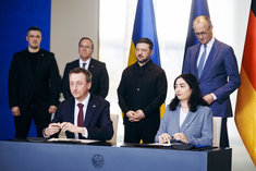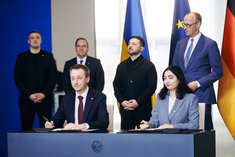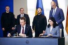 Caption: Zelensky in BerlinReem Alabali-Radovan (SPD), Bundesministerin fuer wirtschaftliche Zusammenarbeit und Oleksii Sobolev, Entwicklung, und Minister fuer Wirtschaft, Umwelt und Landwirtschaft der Ukraine unterzeichnen Absichtserklaerung zur Foerderung des Wiederaufbaus und Widerstandsfaehigkeit der Industrie im Bundeskanzleramt im Rahmen der Deutsch-Ukrainischen Regierungskonsultationen in Berlin, 14.04.2026.