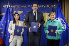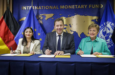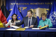 Caption: Reise Alabali Radovan nach WashingtonReem Alabali Radovan (SPD), Bundesministerin fuer wirtschaftliche Zusammenarbeit und Entwicklung, aufgenommen im Rahmen ihrer Teilnahme an der Jahrestagung der Weltbank und des IWF in Washington. Hier mit BM Klingbeil und Kristalina Georgieva (Geschaeftsfuehrerin Internationaler Waehrungsfonds) bei der Zeichnungszeremonie mit dem IWF anlaesslich der Verkuendung neuer Mittel für den ‚IWF Capacity Development Fonds‘. ‚Fotografiert im Auftrag des Bundesentwicklungsministeriums'