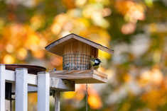 Caption: Kohlmeise im HerbstKohlmeise in einem Vogelhaus im herbstlichen Berlin, 20.10.2025.