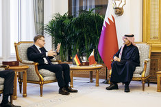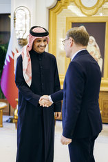 Caption: Johann Wadephul reist in nach KatarJohann Wadephul (CDU), Bundesaussenminister, trifft Mohammed bin Abdulrahman bin Jassim Al Thani, Premierminister und Aussenminister von Katar, zu einem Gespraech in Doha. 11.03.2026. Fotografiert im Auftrag des Auswaertigen Amtes (AA)