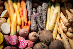 Stichworte: Wurzelgemuese Karotten carrots Pastinaken Petersilienwurzel Rote Bete Rote Bete Chioggia Ringelbete beetroot Essen und Trinken Ernaehrung Nahrung Nutrition food eat drink Lebensmittel Nahrungsmittel foodstuff Gemuese Vegetable Gesund gesunde gesunder gesundes Healthy ausgewogen vegan vegetarisch vegetarian Supermarkt supermarket Auslage display