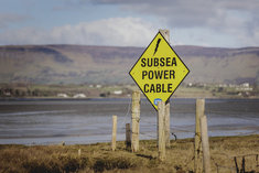 Caption: UnterseekabelEin Schild weist auf ein Untersee-Stromkabel hin in Scarden, 09.03.2026.