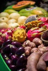 Stichworte: Papaya Drachenfrucht Drachenfruechte dragonfruit Kurkuma turmeric Aubergine Auberginen eggplant Rambutan Frucht Fruechte Obst Obstkiste fruitbasket Essen und Trinken Ernaehrung Nahrung Nutrition food eat drink Lebensmittel Nahrungsmittel foodstuff Fruit Supermarkt supermarket Auslage display vegan vegetarisch vegetarian