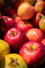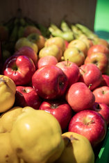 Stichworte: Apfel Aepfel Quitte Quitten quince Birne Birnen apple pear Frucht Fruechte Obst Obstkiste fruitbasket Essen und Trinken Ernaehrung Nahrung Nutrition food eat drink Lebensmittel Nahrungsmittel foodstuff Fruit Supermarkt supermarket Auslage display vegan vegetarisch vegetarian