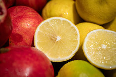Stichworte: Granatapfel Granataepfel pomegranate Zitrone Zitronen lemon Frucht Fruechte Obst Obstkiste fruitbasket Essen und Trinken Ernaehrung Nahrung Nutrition food eat Lebensmittel Nahrungsmittel foodstuff Fruit Supermarkt supermarket Auslage display vegan vegetarisch vegetarian