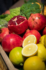 Stichworte: Granatapfel Granataepfel pomegranate Zitrone Zitronen lemon Brokkoli broccoli Frucht Fruechte Obst Obstkiste fruitbasket Essen und Trinken Ernaehrung Nahrung Nutrition food eat Lebensmittel Nahrungsmittel foodstuff Fruit Supermarkt supermarket Auslage display vegan vegetarisch vegetarian