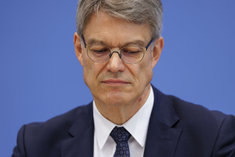 Stichworte: Portraet Portrait neutraler Hintergrund neutral background Freisteller freistellbar Bundespressekonferenz bpk Federal Press Conference Textfreiraum Text freier Raum Copyspace Copy Space Text Blank sitzend sitzende sitzender sitzendes sitzen sitzt sitting sieht nach unten looks down schaut runter