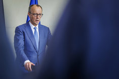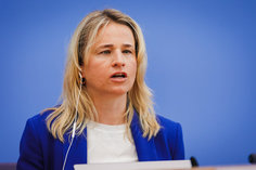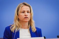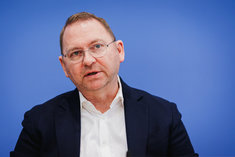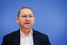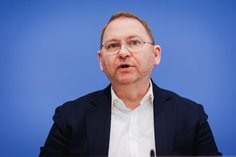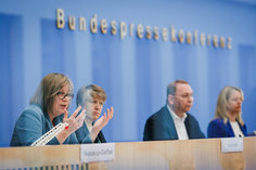 Stichworte: Politik Politics Bundespressekonferenz bpk Federal Press Conference Portraet Portrait Frontal Von Vorne front view neutraler Hintergrund neutral background Freisteller freistellbar Halbe Figur Halbfigur half-length waist up Anschnitt gate sitzend sitzende sitzender sitzendes sitzen sitzt sitting sieht nach rechts looks to the right sprechend sprechen spricht sprechende sprechender sprechendes Talking
