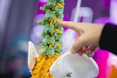 Caption: LendenwirbelsaeuleSymbolbild: Eine Person zeigt auf die Lendenwirbelsaeule eines Lehrskeletts. Aufgenommen im Rahmen der didacta Bildungsmesse in Koeln, 10.03.2026.
