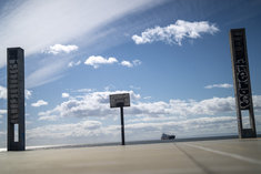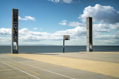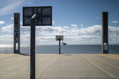 Stichworte: Chile Patagonien Punta Arenas Magellanstraße Küste Meer Horizont Himmel Wolken Sportplatz Basketballplatz Freiplatz Basketballkorb urban Stadt Architektur minimalistisch Weite Reise Outdoor keine Menschen
