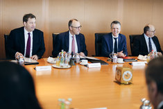 Caption: KabinettFriedrich Merz (CDU), Bundeskanzler (2.v.r), Lars Klingbeil, Bundesminister der Finanzen 3.v.r), Thorsten Frei (CDU), Chef des Bundeskanzleramtes (r) und Alexander Dobrindt (CSU), Bundesminister des Innern (m), aufgenommen im Rahmen der Woechentlichen Kabinettssitzung im Bundeskanzleramt in Berlin, 04.03.2026.