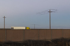 Stichworte: Kalifornien Stadt City Verkehr Traffic LKW gelb Stromleitung Voegel Vogel Himmel Zaun Strommast Truck