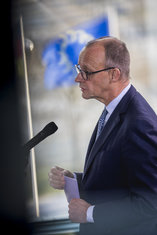 Stichworte: politik editorial Friedrich Merz portaet Portraet Portrait head headshot sieht nach links looks to the left textfreier Raum Textfreiraum Text freier Raum Copyspace Copy Space Text Blank sprechend sprechen spricht sprechende sprechender sprechendes Talking Europaflagge European flag EU flag EU flagge profil Profil Profile
