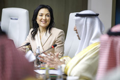 Caption: BM Reiche reist nach Saudi ArabienKatherina Reiche (CDU), Bundesministerin fuer Wirtschaft und Energie, reist mit einer Wirtschaftsdelegation nach Saudi Arabien. Hier bei einer Rede zur Grundsteinlegung auf einer Baustelle von Juffali Commercial Vehicles (JCV), exklusiver Vertriebspartner fuer Mercedes-Benz Lkw und Busse in Saudi-Arabien, und Saudi Liebherr Company ltd. Djidda, 01.02.2026 Fotografiert im Auftrag des BMWE