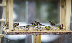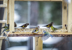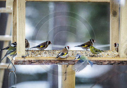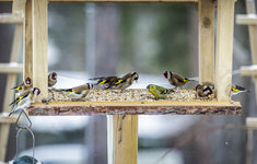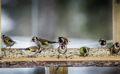 Caption: VogelStieglitze und ein Erlenzeisig