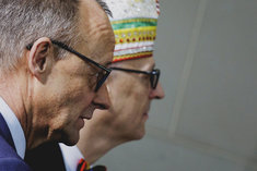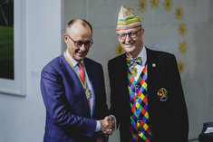 (L-R) Friedrich Merz (CDU), Bundeskanzler, und Klaus Ludwig Fess, Praesident des Bund Deutscher Karneval e.V., aufgenommen im Rahmen des traditionellen Karnevalempfangs im Bundeskanzleramt in Berlin, 03.02.2026.