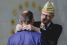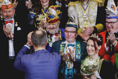 (L-R) Friedrich Merz (CDU), Bundeskanzler, und Klaus Ludwig Fess, Praesident des Bund Deutscher Karneval e.V., aufgenommen bei der Uebergabe eines Ehrenordens im Rahmen des traditionellen Karnevalempfangs im Bundeskanzleramt in Berlin, 03.02.2026.